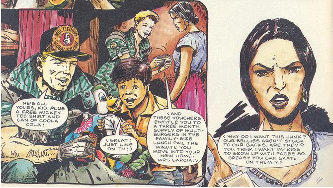 The format of the strip: two fourteen-page installments, allowed for a quick presentation of a story, before moving on. Mills and Ezquerra didn’t waste their breath. Immediately readers were told about psychological warfare battalions (which our cast were part of), Agent Orange and free fire zones (cattle grazing land prepared by napalm). I was introduced to phrases like “Low Intensity Conflict” and the global horrors of the debt crisis engineered and fed on by Western bankers of the IMF. One story focussed on Coca-Cola’s links with death squads, forces which continue to be complicit in the murder of trade unionists in Guatemala, twenty years before Mark Thomas’ would write Belching Out The Devil. Before he would write about Britain as one of the world’s major arms suppliers to repressive military regimes in the form of CS gas, leg irons, armoured cars, surveillance systems and gallows. In one discussion of strobe guns a character remarks, “Its okay, its been tested in Northern Ireland”. Mills wrote about torture and disappearance, child soldiers and secret police. He talked about food irradiation and sterilisation, while Alan Moore was still pottering about with his giant naked blue man’s penis.