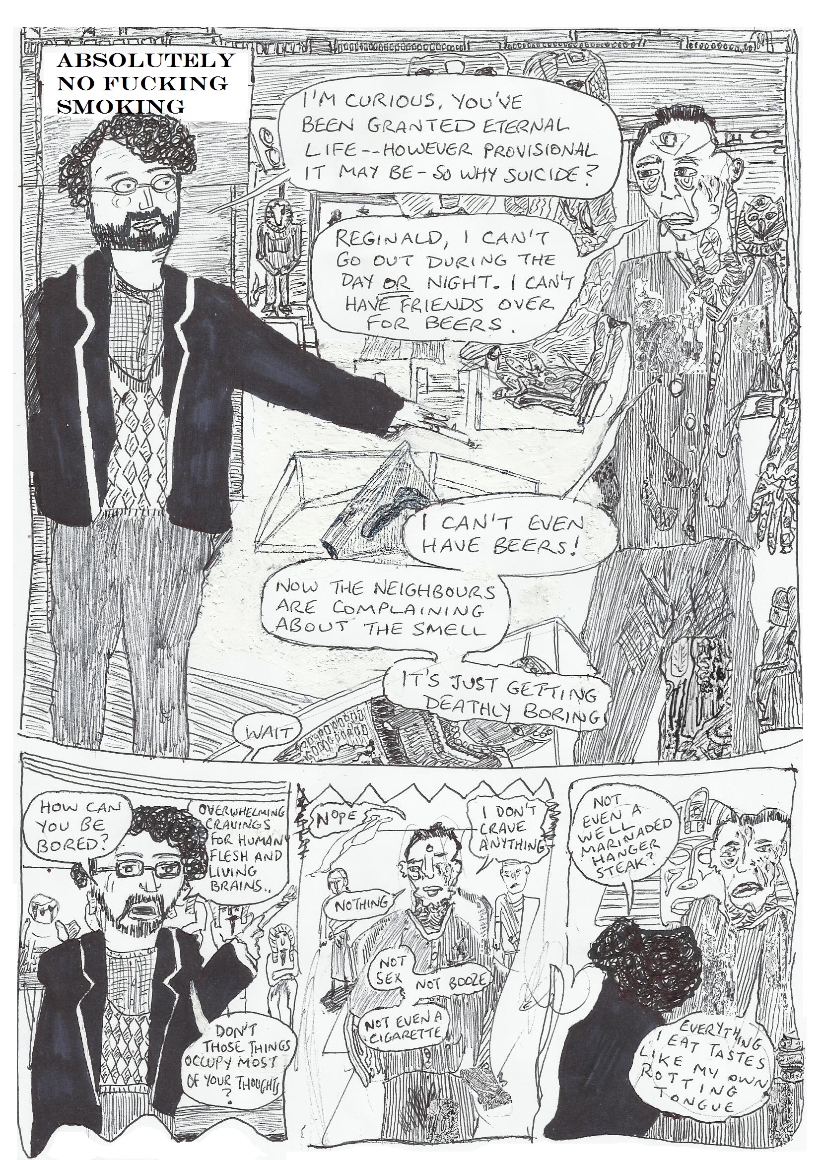 I had been really enjoying the exploration of biro, the confidence in knowing the next pen won’t cost a half day’s income. Biro goes everywhere, can do anything, it’s wilfulness to mercury can help spoil a background page, or pull a Steadman/McKean/Sienkiewicz grace dance. Paddy Brown‘s biro comics convey spontaneity first. Though also the zine-comics movement, which deserts the pretension of blatant-commercialism. Though sell the fecking feck out of this if you’re sufficiently motivated.